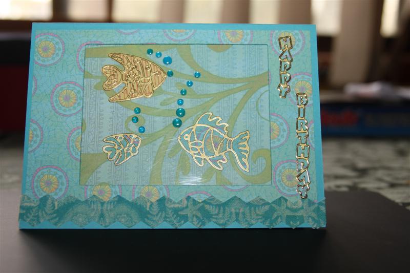 The last couple of days I have had my webmaster guru/photogragher sitting next to me as I learn how to do all this ( I truly am computer illiterate) but he is out tonight and I am flying solo. Lets see if I can do it! This card uses stampin up cardstock – tempting turquiose and stampin up designer paper too – kaliedascope – I have cut an aperture in the front of the card and put some acetate behind it, then stuck fishy outline stickers on more designer paper and stuck them on to the acetate. There is a little zigzag material running along the bottom of the card which is from Websters Pages.No creating done tonight as its shopping night, oh well always tomorrow!