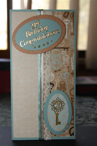 I am still playing with the kaisercraft Le Chataeu collection . For the card above I used stampin up cardstock – black, a key sticker, ovals die cut using my spellbinders, and ribbon from my craft supply. For the card below I used Stampin Up cardstock baja Breeze, a key sticker, ribbon and lace and kaisercraft pearls.It’s funny how just changing the accent colours on a card can change the suitability from male to female. I always look for papers like this as they are such good value for money.I have put this paper away for now, but I haven’t finished with it yet!