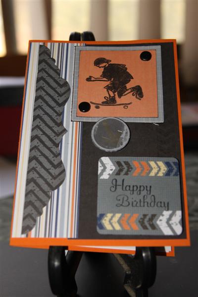 A quick card for a young man! Stampin up cardstock – pumpkin Pie, Kaisercraft Rewind collection 6″ paper pads and a kaisercraft stamp completes this card! I love 6″ paper pads of any company because all the co-ordination is done for you!