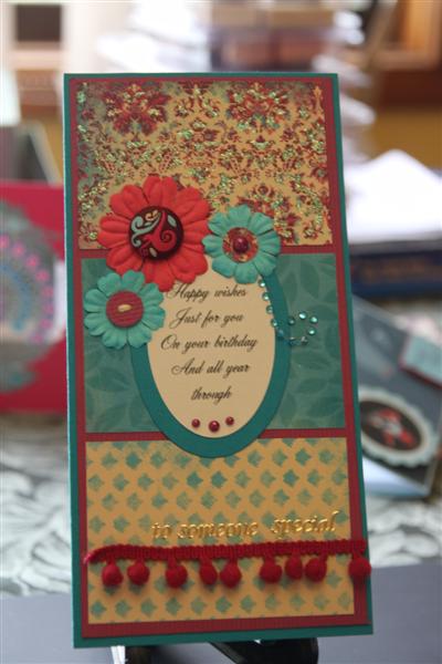This kaisercraft paper is lovely, but I found it hard to come up with ideas for. Most of the pages in the 6′ pad are heavily patterned, and I will have to play with it a bit more before I am completely happy with the results.I used stampin up Taken with teal cardstock which co-ordinates perfectly, and matching flowers, brad and rhinestones from kaisercraft. A computer generated sentiment matted onto more Taken with Teal and trim from my supply completes this one.