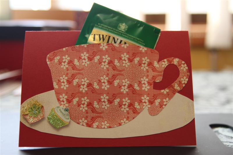 Early post today because its shopping night! This card base is stampin up Riding hood red, with the cup and saucer cut out from Basic Grey’s Nook and pantry 6″ paper pad, the cupcakes are fussy cut from the same paper pad, and the tea bag that is tucked in the top is a Twinings! This card could be used for a number of reasons – birthday, friendly hello or get well soon. See you tomorrow!