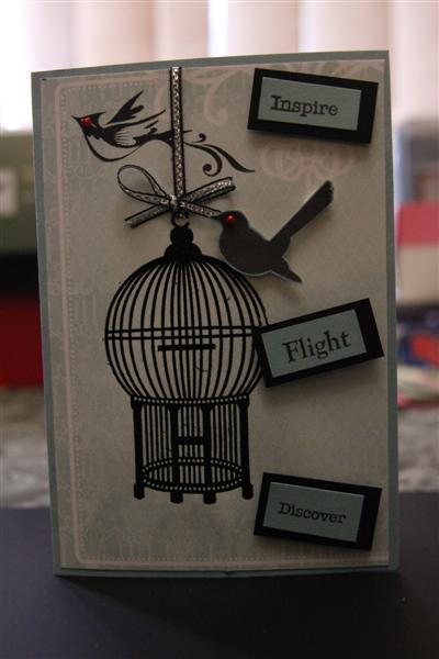 Tonights card was great fun to make! I used Stampin up cardstock – Baja Breeze – and kaisercraft Le Chateau 6″ paper pad.The Birdcage is a  Kaisercraft Le Chateau clear stamp which I stamped and then heat embossed with black embossing powder. I was trying out a new black powder as I wasn’t happy with the one I had, and I am most impressed with this one – it gives a nice thick layer, with very little speckling which is a problem with black powder. It’s called zing! and is by american crafts. I picked it up at spotlight and it was a very reasonable price. They had a huge range of colours,and it is a good sized jar. I will be going back for more colours!Anyway,back to the card.The little bird is fussy cut from kaisercraft Loire Valley, and the word and bird stamps are by inkadinkadoo. The ribbon is from my craft supply.Today I have been working on mens cards,as Fathers Day is only a few weeks away, but I only get a few done when I have to do a completely girly one just to get my bling fix! You will see these cards at some stage next week, once I get my photographer organised, And we still have a few  to go in this current group. Thanks for visiting, see you soon !