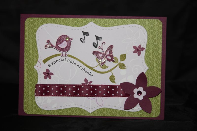 Another lovely Sunday, although it was very cold down at the market at 6am this morning.I did a good trade, but not too many people around, they were probably taking advantage of the fine weather, and Mum tells me that the Gawler show was on today, which wouldn’t have helped matters!Todays card uses Stampin up Rich razzleberry cardstock, Top Note die,rich razzleberry ribbon,flower(made with stampin up punches) ,Stampin up cottage garden patterned paper, stampin up stamps – Cheep talk and cottage garden,and rich razzleberry and old olive ink pads. The music note is a kaisercraft stamp and as usual I used Kaisercraft blling and Kindyglitz.Til tomorrow….