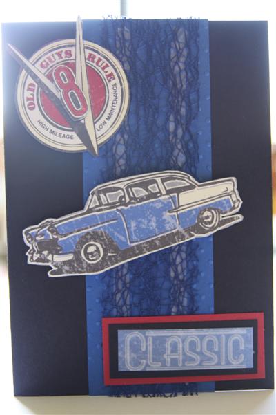 This paper was a lucky find in a little shop I wandered into, and as soon as I saw it I thought of my husband and my brother – in -law, so thats their next birthday cards sorted! I used Stampin Up blackĀ , brilliant blue and riding hood red cardstock, some mesh ribbon and the paper was Creative Imaginations – Old Guys Rule! Off to have a good session, I still have new toys not yet played with as I have been busy doing orders. Til tommorrow….