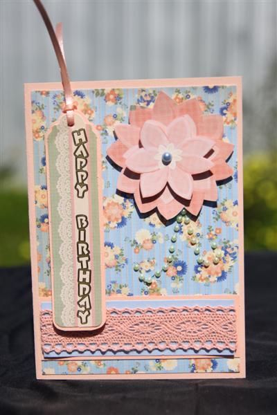 Todays card is made using Bazzill cardstock, Kaisercraft Tea at Elsies patterned paper, Kaisercraft pearls, and ribbon and lace from my craft supply. Kay and I had a lovely day over at mums today, making cards, and showing each other new ideas, and I got my new toy from Kay – a brayer – but I am going to have to practise with it a fair bit before anyone sees anything I do with it! Til tomorrow…
