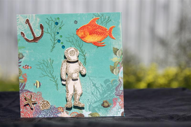 I really enjoyed playing with these new stamps from Oxford Impressions. The set is called The Deep and there are alot of stamps in the set all themed around the oceon. The patterned paper I used was Websters Pages 6″ pad – Seaside Retreat and I also used a variety of ink pads including Stampin Up close to cocoa (the diver) Riding hood red and old olive, and Tim Holtz distress inks spiced marmalade and scattered straw.The anchor and shells were heat embossed.Tonight I am teaching myself how to use my new brayer,but I still need a lot more practise. Til Tomorrow….