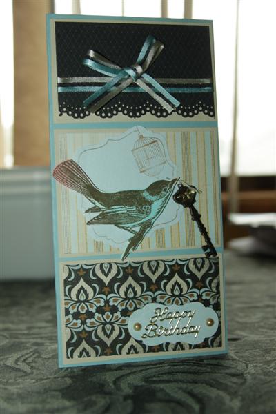 Tonights card is a 21st card, using Stampin Up cardstock – Baja Breeze and Kaisercraft Le Chateau 6″ paper pad and `key . I used an Oxford Impressions bird stamp from the Nature stamp set and the ribbon is from my craft supply.My back is a little better today, and I managed to sit for a short while and make up some xmas cards, so I’m feeling much happier! Til tomorrow….