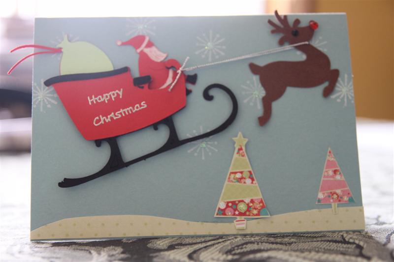 My favourite cardmaking technique is paper piecing. I love the idea of creating little scenes and works of art on the front of a card, so I had great fun making this card. I used Stampin up cardstock – Bashful Blue – and fussy cut the trees out of Kaisercraft ‘Be Merry paper. I stamped the background with a retired Stampin Up stamp, EK success reindeer punch, and finally had a good play with my new Cricut and some stampin up cardstock to make santa! Tonight I will make a couple of quick cards for my boxes, and then a little t.v. before an early night as I have to be up at 4.30 am for work at 6 tomorrow. Til tomorrow….