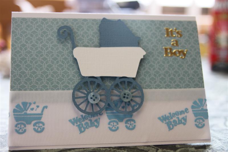 IHi all, this is the second time I have blogged tonight as just as I hit publish the whole computer system shut down so this time will be short and sweet. Here I have used white cardstock, Stampin Up designer paper – Elegant soiree, and I cut the pram using my Cricut. The ribbon is from my supply. Everyone out tonight, so I have cardmaking gear all over the dining table, and am having a ball! I’ve been trying some new things this week so hopefully will photos of that soon ! Til tomorrow….