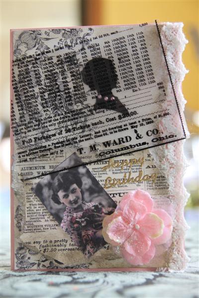 I have been enjoying creating some vintage birthday cards. This one uses Stampin up cardstock – Blushing Bride, and newsprint designer paper. I also used Websters pages patterned paper, a photo image from Collections Elements, lace and prima flower and Tim Holtz distress ink in Walnut stain.There is also a bit of an acetate transparency on there too! Well it’s been a very hot day here in adelaide today, and not much energy for anything, but I will sit tonight and play around with some patterned paper, I have told myself I have to use some of it up before I can buy more. Not sure if I will listen to myself ,in fact , pretty sure I won’t, but the thought is there!