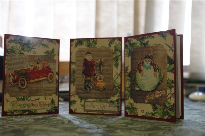 Tonights group of cards uses Bobunny’ s xmas paper – I told myself I didn’t need any more xmas paper but when I saw this sheet I just had to have it! It goes very well with Stampin Up Cherry Cobbler cardstock, and the music paper is from Tim Holtz Seasonal stash.I cut the images out of the paper. Today was Market day, and although there were quite a fewĀ people around, no-one was buying anything. I did alright, as my regulars all came to see me, but some stalls went home with all they came with!Anyway I will have a break from the market next month, and go back at the end of January. I can sort out my stock, and start fresh for the new year. Til tomorrow….