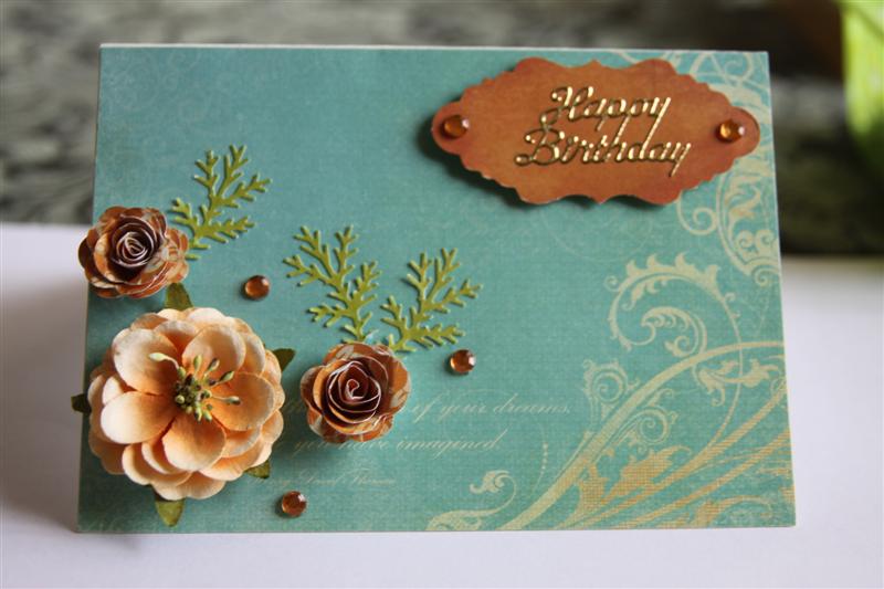 For tonights card I have used Kaisercraft Devonshire Tea patterned paper, and rhinestones. I also used a Martha stewart punch and a Prima flower. The smaller flowers are made with more patterned paper and a sizzix die which cuts the flower shape into a spiral and then you roll it up. I love this! I have only played with it up at the shop, but I have one on order,and will get so much use out of it. It cuts in two sizes, and the ones I made were the smaller size.I am putting together a folder of card ideas for my lessons, so tonight I am going to be working on some more samples for it.Til tomorow….