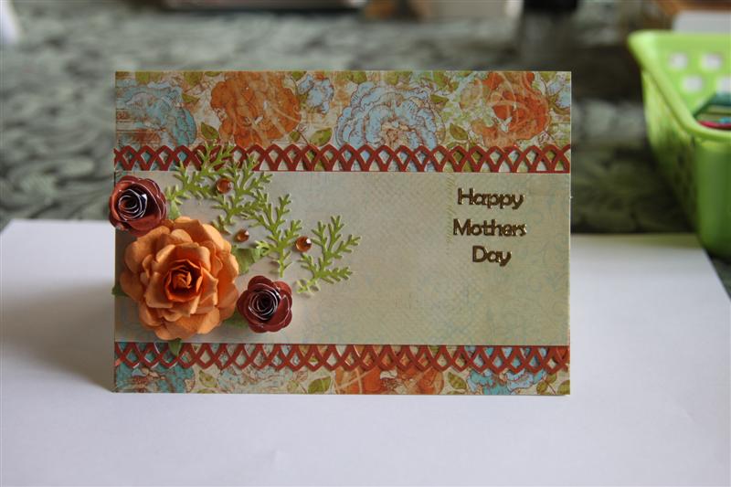 Again I have used paper from Kaisercrafts range of Devonshire tea.I have used Martha Stewarts punches, some bling , a Prima flower, and I made the little ones out of the patterned paper. Yes I have already started making my Mothers Day cards, because last year I made 80 and ran out, so thought I would start early this year and just do a few each week so I don’t get bored doing them.Tonight I am playing with my new jumbo wheel from stampin up. I recently bought 2 new wheels, but haven’t had time to play with them yet. Til tomorrow….