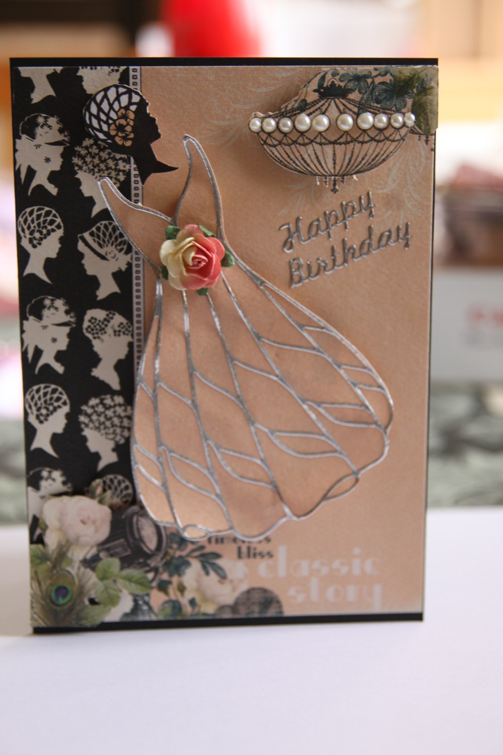 Tonights card uses Black cardstock – Stampin Up, and Websters Pages Hollywood Vogue patterned paper.I also used a dress sticker, Kaisercraft pearls, and a flower from my supply. I did my favourite fussy cutting around some of the paper.I have done something wrong tonight with the photo, and it has taken over my whole blog! I will have to get my techie onto it when he gets home . In the meantime – sorry! – Til tomorrow…..