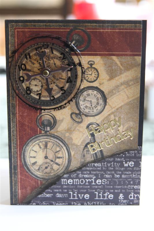 Another of my favourite brands of paper! This card uses Graphic 45 – A Proper gentleman, and Collections elements script paper and acetate. The clock hands are Tim Holtz Ideology. A quick post tonight as I have a couple of orders to do. Til tomorrow…..