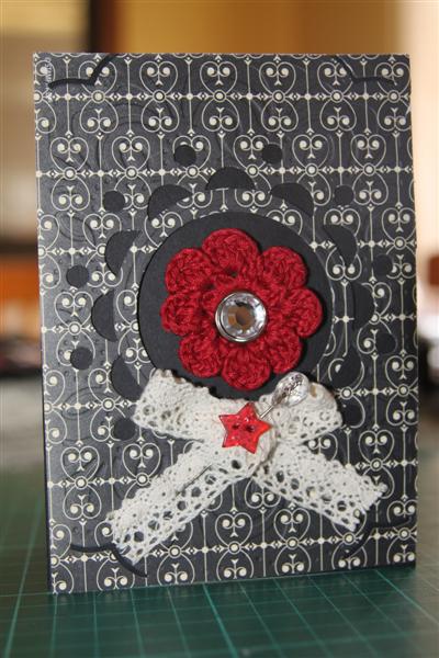 I’m excited about todays card. I know I said yesterday that I would put up my final English rose card today, but I finally found everything I wanted to complete a range of cards that I had in my mind since I purchased this paper back in september, and in a flurry of creativity have completed 5 in my series, with more ideas bubbling over, so over the next few days I will be putting up the cards I have made so far with my Stampin Up patterned paper – Love Letters. On this one I also used black cardstock, a Maya Road stick pin, A Ruby rocket crocheted flower and button ( my exciting find in a clearance bin!) a bit of lace, and my new cuttlebug emboss and cut folder. Off to create some more! Til tomorrow….