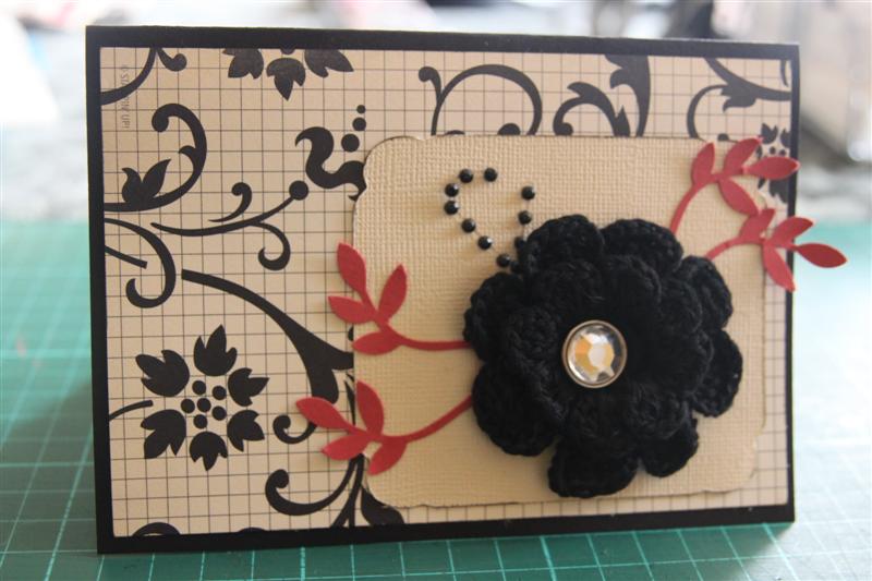 Continuing on with my series using Love Letters Stampin Up designer paper tonights card also uses Stampin Up cardstock and leaves punched using the stampin Up bird punch. I have also used some Bazill cardstock, die cut using my Cricut and a Ruby Rocket crocheted flower. I am going to find out how to make those crocheted flowers, I think my sister Kay might know.I really like the effect they make on a card, and it wouldĀ save some money if I could make them. Til tomorrow….
