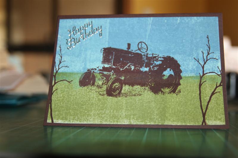 I missed last nights post as apparently we were backing up the computer, so I thought I would do an early one today. This is the second card I have made using Oxford impressions tractor from the country Girl set. This time I brayered the background ( still getting to grips with this technique) and stamped a couple of twiggy bits from my Stampin up set – Bird on a branch. The cardstock used is stampin Up choc chip. I am now set up in my craft room, thought I would have chucked a lot of stuff out in the move, but nothing went in the bin, and I found things I had completely forgotten about, and can’t wait to have a good long session to play with everything! Til tomorrow….