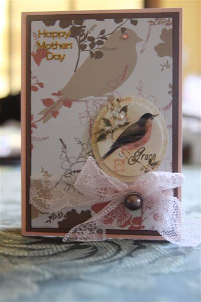 When I was moving all my gear into my new craft room I came across this pretty paper,and knew exactly what I wanted to do with it. I don’t know the name or brand but it goes beautifully with Stampin Up cardstock – Blushing bride and Choc Chip. I used a K&Co die cut, a brad from Kaisercrafts new range and a little piece of lace to finish.Today over at mums I started quite a few projects, so tonight I am going to complete some of them! Til tomorrow…..