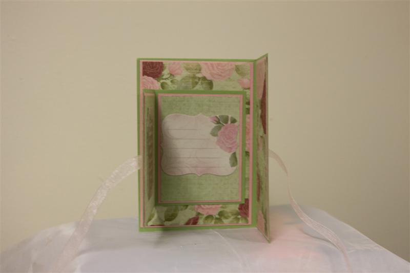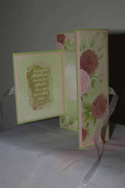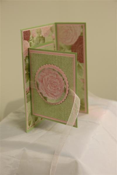 Three views of the same card today, because I wanted you to see how this one was constructed. Its quite easy, just a fair bit of layering. I used Bazil cardstock for the pink, and Stampin Up cardstock for the green, and the paper is Kaisercraft English Rose.The only other thing needed was a length of ribbon to tie it all together.I quite like this style, and I  have done a few with different papers now. Market day today, a lot of stalls, quite a few people, and the time flew, but tired now, so I’ll cook tea and very early bed tonight! Til tomorrow….