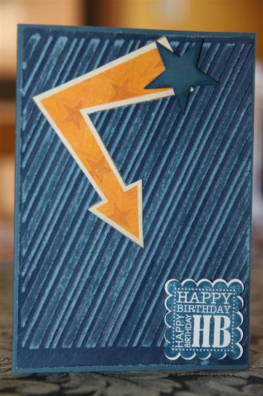 Tonights card is a good one for those male cards that we all seem to struggle with. I used Stampin Up cardstock – Not quite Navy, and Coredinations cardstock which I embossed and sanded. The greeting is a stampin Up stamp from the punch Bunch collection which I stamped and punched. I also used a Fiskars star punch and an arrow cut from an unknown scrap of paper. Tonight I’m looking forward to making a few new cards, I’ve been sitting jotting down some ideas in my sketch book, something I have just started doing  so we’ll see how it works! Til tomorrow…..