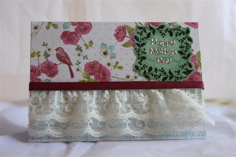 Another Mothers day card using Prima Madeline patterned paper and die cut stickers, ribbon and some double layered lace. I fell in love with this lace when I saw it in the shop, and had to have it It works well with this style of card.Hope you are all enjoying our extended break – til tomorrow…..