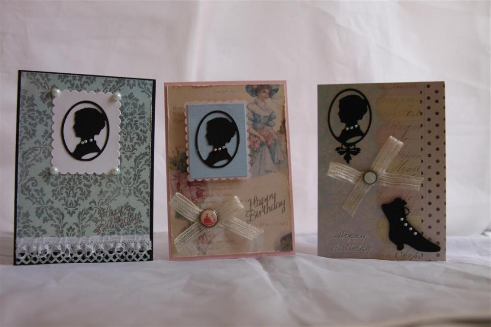 I have certainly made good use of my cricut Heritage cartridge, and used it to cut these cameos for this group of cards. The papers are by Melissa Francis, and I love the softness of these new papers. I also used Stampin up and bazzil cardstock, My minds eye lost and found brads, kaisercraft pearls and asstorted lace.Today I have been doing some orders that I fell a bit behind with, but have cleared them, so its back to creating! Til tomorrow…..