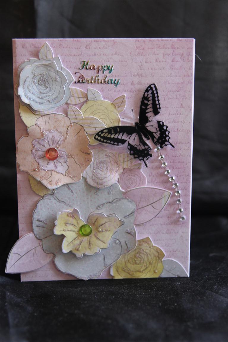 Todays card was made using Pink Gelato paper from Kaisercrafts most recent collection. I also used some kaisercraft dewdrops,and rhinestones and fussy cut some of the flowers from another sheet of paper in the collection. I added an acrylic printed butterfly from Elements collection.Its been a lovely day here in Adelaide, so not much crafting, and lots of sitting in the sun! Til tomorrow…..