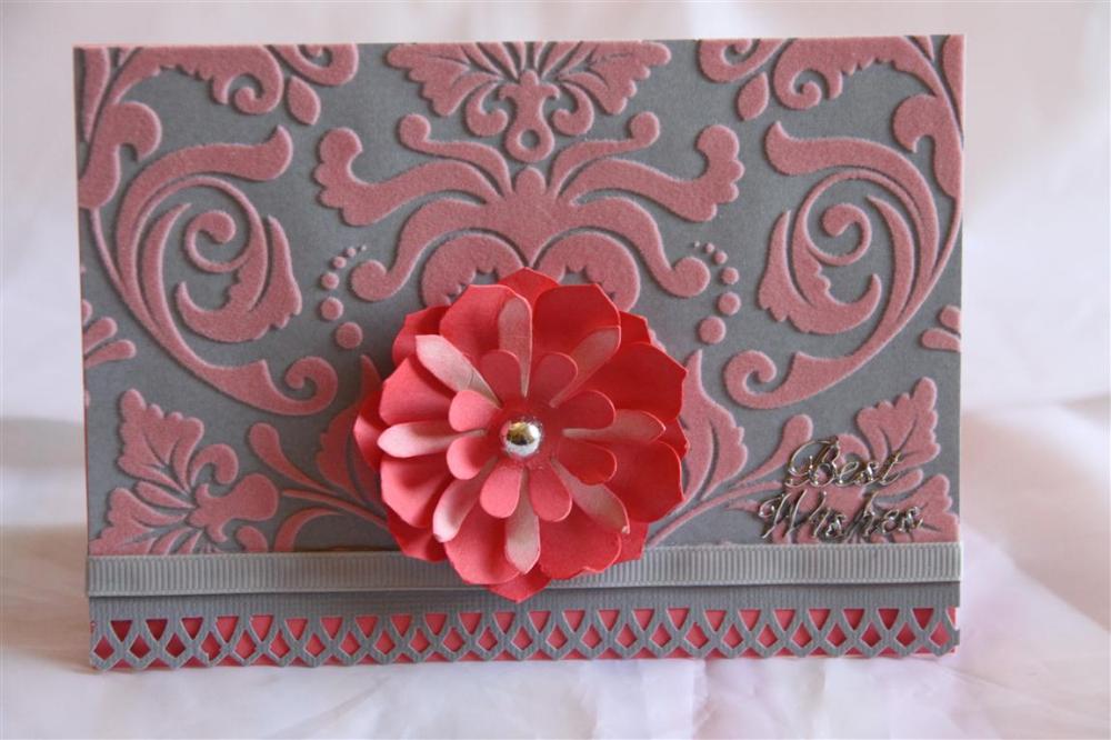 This is one of three cards we made the other night in my retirement village class. The backgroungd paper was a flocked design by teresa Collins, and the cardstock was bazzil and Stampin up – Cameo coral – retired, and I have nearly exhausted my supply of that particular colour.We used a martha stewart punch, some ribbon, and for the flower we used Stampin Up sizzix die – Blossom Party. The flower was sponged with matching ink, and misted with water so that we could mould the shape a little bit. I was busy today over at Paper flourish planning my August lesson,but I’m full of creative ideas, so I’m planning to spend some time in my craft room tonight! Til tomorrow….
