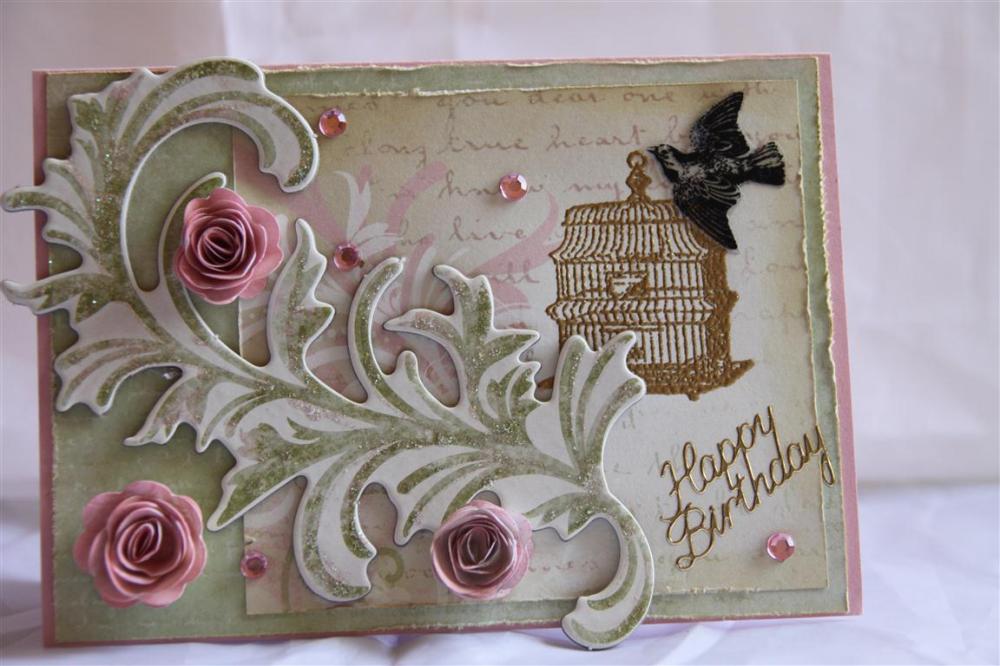 Quite often I play with a range of papers til I’m all out of ideas, but I still have some paper left, so it gets filed away,til its discovered again and I have a whole lot of new ideas for it. That happened with this paper – Kaisercraft English Rose. I had made so many Mothers day cards with this paper, but tonight I am shiowing something a bit different. I also usedthe matching chipboard, and oxford impressions stamp from the Nature set, elements Collection printed acetate, and I hand rolled some flowers.Til tomorrow…..Â