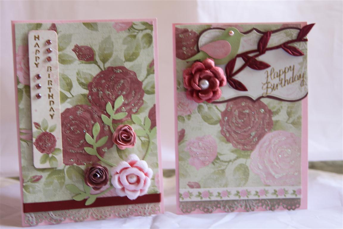 Here are the other two cards i made while I had the Kaisercraft English Rose paper out. I used Stampin Up cardstock ( pink Piroutte) for the bases, and my Stampin Up bird punch, Martha Stewart lace doily punch, prima flowers, hand rolled flowers, ribbon and bling. Settling back into work, what a rude shock to the system! Many books in the stockroom still in boxes, but I have been given some help, so we should be caught up by next week! Til tomorrow….