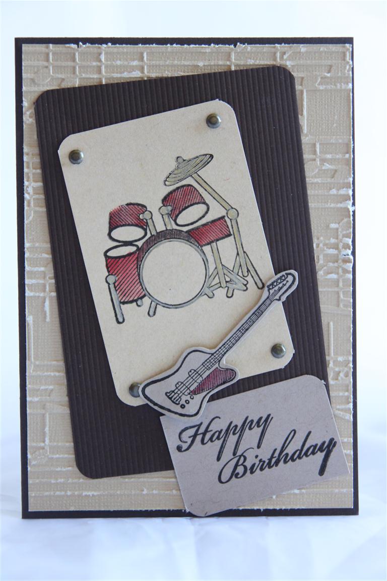 This is a good card for teenagers. The stamps are from the Live Loud collection by imaginisce, and I used my cuttlebug and music embossing folder with some coredinations cardstock for the background. I sanded the background after embossing.The card base is Stampin Up early espresso.I added a few brads for some more texture. I did make a couple of xmas cards last night but then got distracted with my new designer papers from stampin up, so will photo my efforts on the week end to show you! Til tomorrow…..