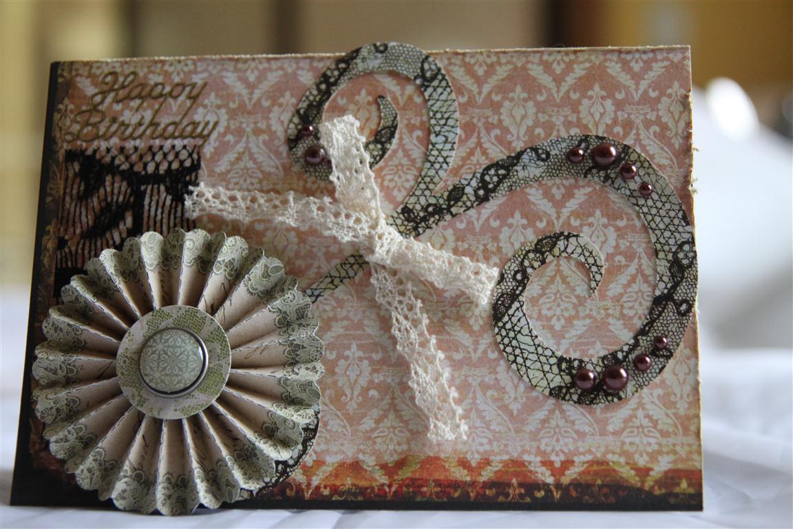 I found some paper that I have had for quite some time, and haven’t really done anything with until now. I used my tim holtz large flower die, and sizzix flourish die and a brad, lace and kaisercraft pearls. i was quite impressed with the flower – quite by accident it cut with the lacy bits at the end and I really like the effect! I have a couple of orders to do tonight, so Til tomorrow….