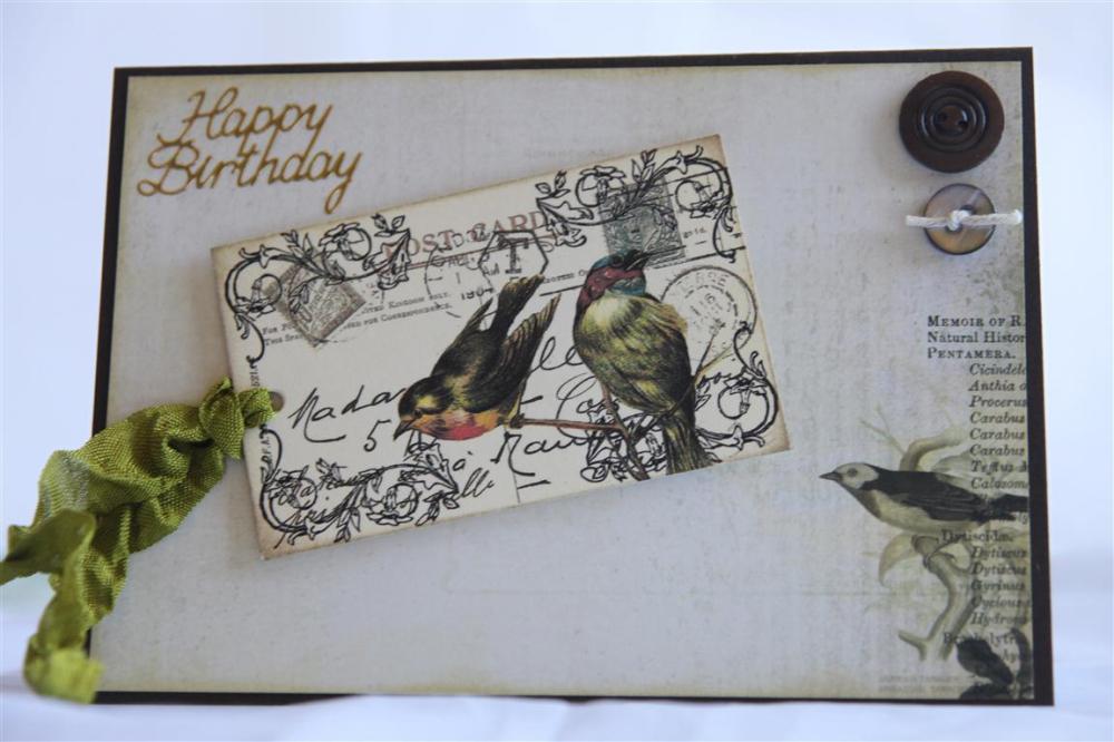 A Friend of mine gave me this gorgeous tag, I’m not sure where she got it from, and although  I displayed it for a while I couldn’t resist turning it into a card to better display it! I used Early espresso cardstock from stampin up, and Kaisercraft Hunt and gather paper, and found a couple of very old buttons in grans button box.Back to xmas cards tonight. til tomorrow…..