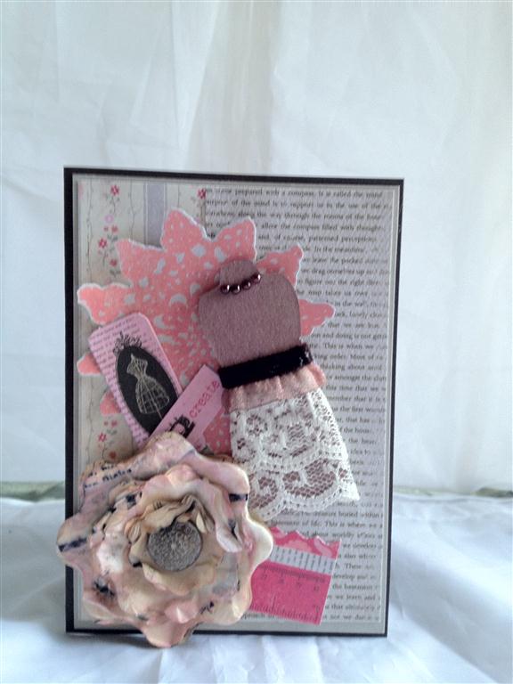 I have shown a couple of cards made from this collection – Authentique Uncommon – but this card is a little different. The chipboard is Kaisercraft which I coloured with an ink pad, and the brad and cardstock ( early espresso) are from Stampin Up. Assorted ribbon, lace and bling, and a Sizzix floral die for   the flower. The flower is interesting as it was a very old paper dress pattern. I found a bag from my late grans stash when my wardrobe exploded ( long story – but short version – wardrobe was too full) and thought Oh I know what I am doing with these, so cut into this one but my boys have banned me from using any more cos they think they can sell them on e – bay! Had fun up at Paper Flourish today setting up my December class, and spending my Birthday money! Til tomorrow….