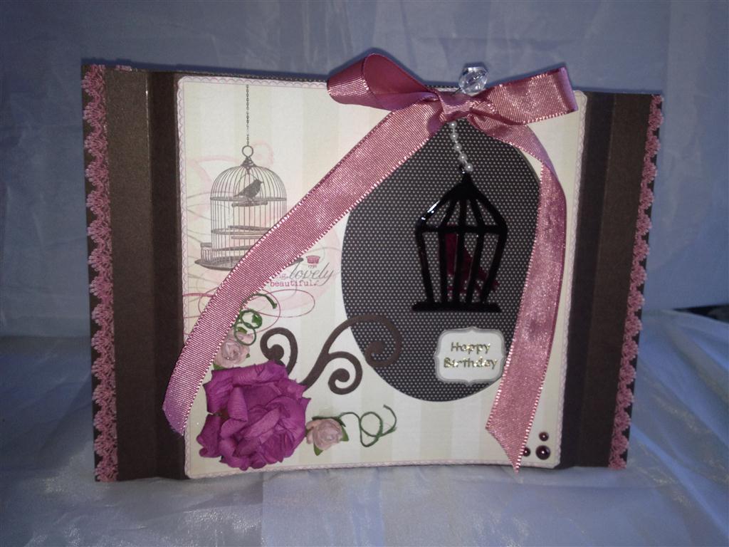 This is my Boss Mariannes Birthday card. I have used Stampin Up Early espresso cardstock, and Die cut an oval on the front panel. then backed both front and back with papers from My Minds Eye Lost and Found Blush 6″ paper pad. Lots of ribbon, lace trim, hat pin, flowers and bling! The bird and birdcage were die cut with a Tim Holtz die, and I coloured them with some glossy accents which was coloured with a drop of ink. ( a great technique, thank you Kay).I had some trouble – the card really didn’t stand very well, so I made it a little stand at the back after we took this shot.Marianne loved it, but wonders at the patience required to make these creations ( maybe I’m not that patient at work!) I’ve never thought about it – I didn’t think patience came into it – what do you all think? Til tomorrow….