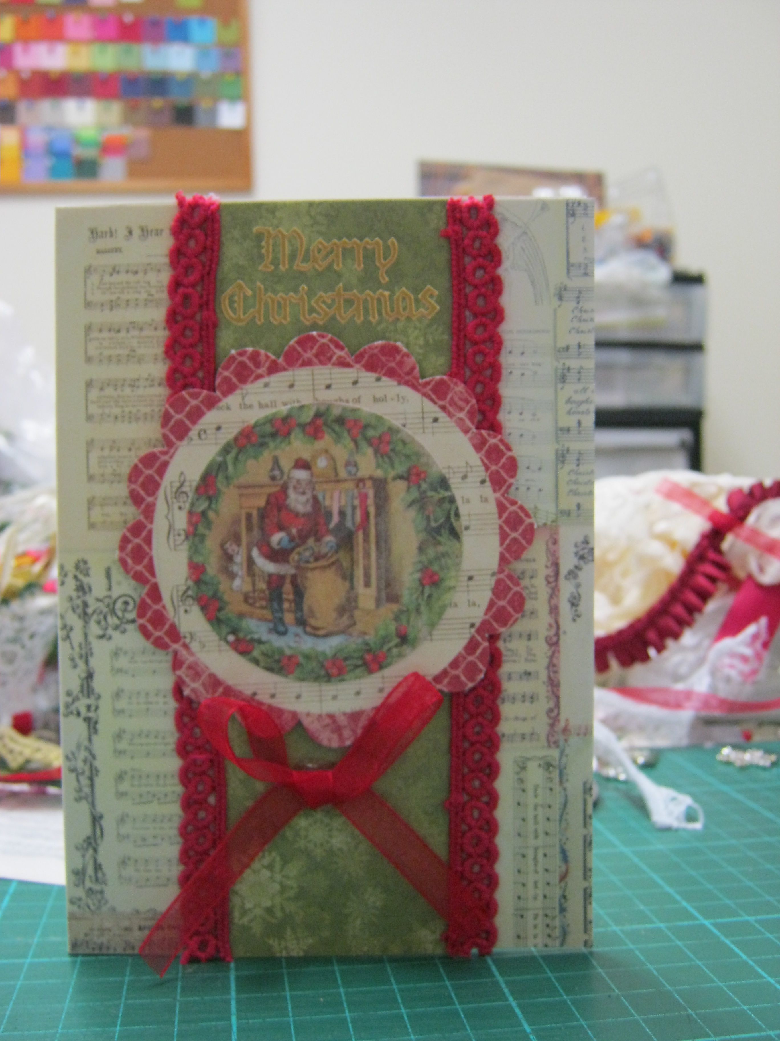 This is number 4 in my Melissa Francis deck the halls series. Only one more to go after this one! I just added ribbon and lace. These cards just make themselves – Don’t you love it when you sit down with a paper collection, and before you know it you have made a dozen cards? It doesn’t happen often to me but when it does ( Like last night) it’s the greatest feeling! I will show last night efforts when Nathan has time to photograph my cards.His camera is still being fixed so we have to rely on my little camera.Til tomorrow…..