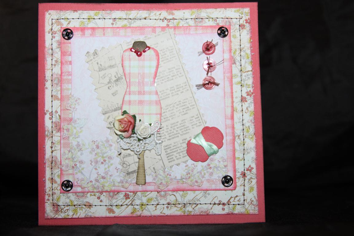 I have thrown a little bit of everything at this card, so my list is quite long – here goes – Bazzil cardstock for the base, Prima Sparkling spring as the paper collection used, a chipboard dress form covered in matching paper,press studs and old pattern instructions from my late grans box ( that sewing box is coming in quite handy!) my sewing machine, assorted lace, buttons and flowers, a label die and ribbon, and all the edges were inked with worn lipstisk distressed ink. phew…great excitement in the craft room tonight as I received my big box of goodies from Kay (stampin Up) today. What to play with first?My mind is spinning with ideas -it could be quite a long session in there tonight, but first I have to cook tea for the hungry hordes, so Til tomorrow…..