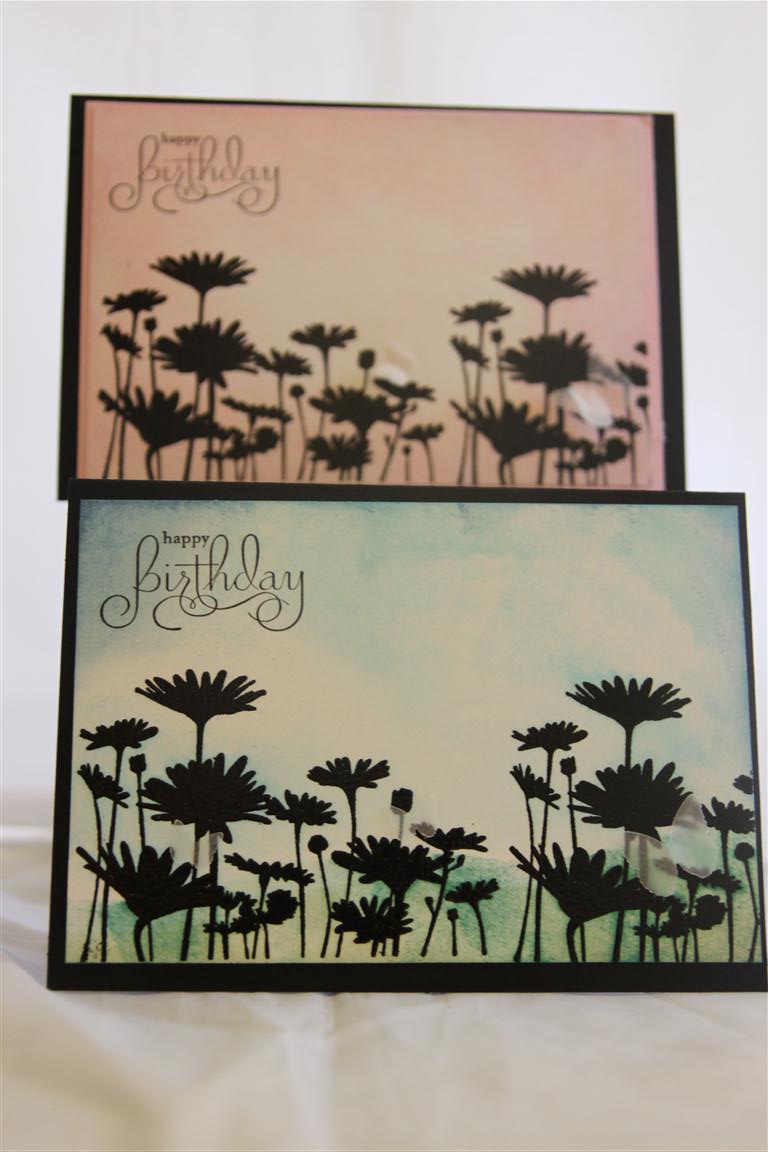 I am still practising sponged backgrounds, but I thought i would show my progress. One day I will master this technique! All cardstock is stampin Up and the stamp used is also Stampin Up – Upsy daisy.I heat embossed the stamp image in black, so far so good, and I have learnt not to be too heavy handed with the sponging and layer the colours slowly, but not quite there yet although I do quite like the effect on the bottom card, looks like clouds – that was purely accidental and I doubt I could repeat it!I am off to the craft room now and looking forward to some relaxing creating time after a busy day at work. Til tomorrow….
