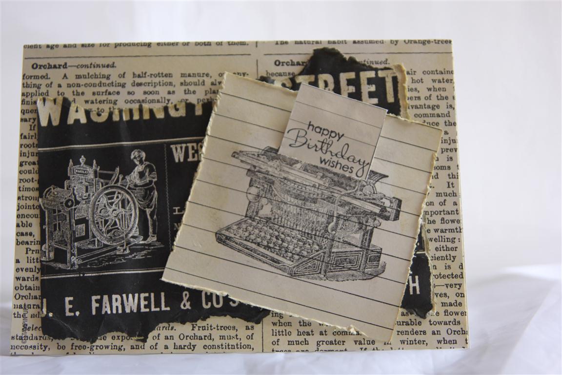 This is the card I made using the Typewriter stamp from the Established Elegance set by Stampin Up.The patterned papers are also from Stampin Up but I can’t remember the name of the collection – Printery rings a bell, but I am sure someone will let me know and put me out of my misery!I did a bit of distressing, inking and ripping ( still have trouble ripping my beautiful papers) and stamped the greeting onto more patterned paper and tucked it into the typewriter. Not my usual style of card, but it’s not in my box any more so someone liked it!Til tomorrow….