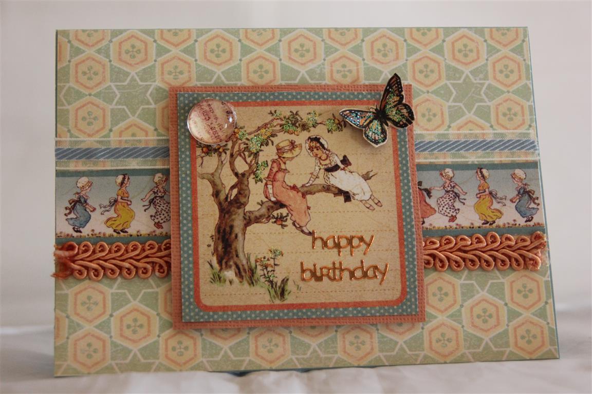 I have been on a bit of a hunt through my photo files looking for the card ( well two actually) that I made for a 40th retro birthday order that I had, and it appears that I haven’t got photos of them although Nathan and I are both sure that we took them. I still have one of the cards so the next time the camera is out we will take a photo so that I can post it! So to todays card – This is Graphic 45 paper – the images are from a Place In Time, and the background is from an older graphic 45 collection – the good thing about Graphic 45 paper is that most of the collections do have pieces that will match with other collections.The bigger image is matted on Kaisercard, and I found some trim in my ribbon drawer that matches perfectly with the blue and orange tones.Taught a class last night, and this morning – lovely ladies, and had a great time. This afternoon was a little nap time to catch up on lost sleep, and now I am ready for the weekend! Til tomorrow….