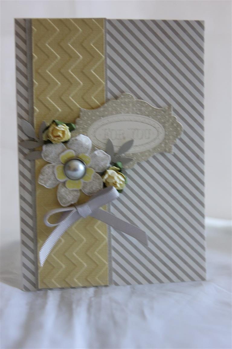 Here is the last Yellow and Grey card – The paper is My Minds Eye – follow your heart, the cardstock is by Kaisercraft, Greeting stamp is stampin up layered labels, and the main flower was made by stamping two flowers from Stampin Up Vintage vogue stamp set, and fussy cutting them out.I added a kaisercraft brad,ribbon bow, a couple of kaisercraft flowers and leaves punched out with a martha stewart frond punch.The embossing folder is a stampin up chevron folder. Til tomorrow…..