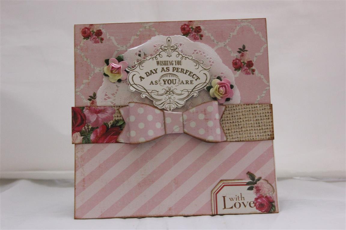 This is the last card that I made using Ruby Rocket Cook papers.Again I made a paper bow and inked around the edges with tea dye ink. I used a doily and the sentiment is from Stampin Up Vintage labels set. I added a couple of flowers and a bit of a tag from the papers to finish. Many distractions here just now, so hope this post makes sense1 Til tomorrow….
