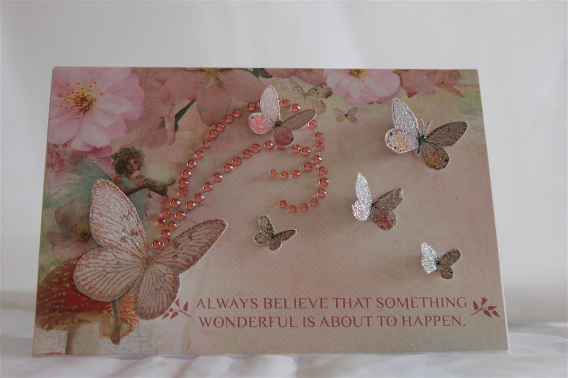 IMG_2800 (Medium)This one is so simple – kaisercraft enchanted garden ( a piece of one of the 12 x 12 papers) and some fussy cut glittery butterflies, with some bling strips, and a 5 minuter card done!quick post tonight as I am running a wee bit late with dinner1 til tomorrow….
