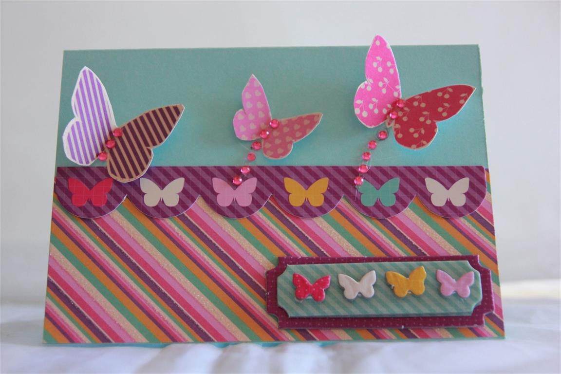 Quite a late post tonight as it has been a very hot day today, and is only now starting to cool down just a little. The papers I used for this one are Kaisercraft Butterfly Kisses , and I used a piece of stampin up cardstock for the base ( bermuda bay )the butterflies were fussy cut from a 12 x 12 sheet – and I am sure those of you who have done my classes will remember the day we used this sheet on our cards – my name was was mud that day with all the fussy cutting we did!I used Kaisercraft rhinestone strips on the butterflies, and a chipboard piece down in the corner. Til tomorrow….