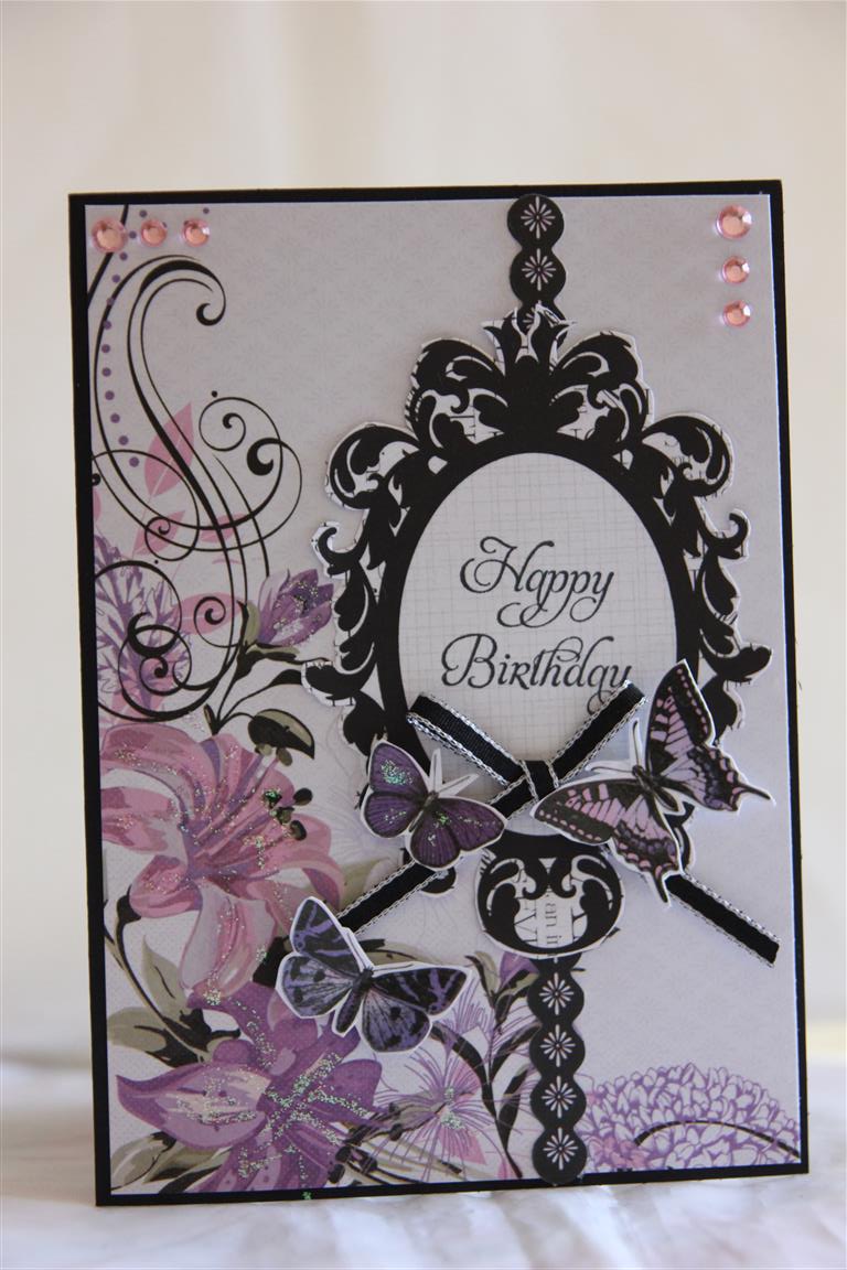 IMG_7864 (Medium)Kaisercraft velvet Crush… 6 ” pad for the background mat, and butterflies also fussy cut from a piece of the pad. The frame is fussy cut from a piece of the 12 x 12 paper, and I used a stampin Up sentiment stamp and cardstock for the base. I added a ribbon bow and rhinestones to finish off this one. I have been back in the craft room this afternoon making a few more cards with this range, but have packed it up for now and have put out some graphic 45 paper – sweet sentiments – it has some great Easter images and so I am going to make a few cards while tea is cooking! Til tomorrow….