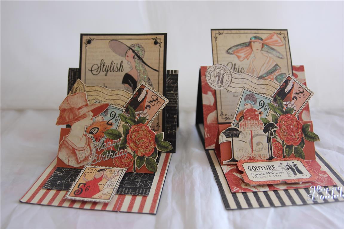 IMG_5870 (Medium)I am back from my little mini break to Perth, and we had a lovely time – a very quick visit, but we managed to squeeze in a lot of sightseeing, and a bit of relaxing too!todays cards uses graphic 45 couture collection paper collection, and I have done a lot of fussy cutting for these ones. The style of card is what I wanted to show you all – I am calling it a double easel card, with the second easel a fair bit smaller than the main easel – I am going to do a youtube video with this style so that you can all see how to do it and the measurements will be on the video – I always learn better by seeing it done – much easier than just reading I think. In my class at paper flourish this friday we are doing cards very similar to this and I can’t wait to do them! til tomorrow….