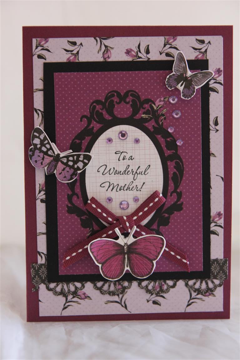 IMG_1067 (Medium)I have a few more cards to show that I made with Kaisercraft Velvet Crush paper collection. This collection sold out very quickly at my local papercraft store,and I beleive kaisercraft are out of stock at the moment too, it’s been so popular.The colours are gorgeous I have to say… These few cards that I made are Mothers day cards – I start them early because I sell so many Mothers day cards – it’s busier than christmas for me!for this one I used the 12 x 12 papers, and i fussy cut some butterflies out of some of the paper, and there is a butterfly from the collectables there too. The sentiment, cardstock and ribbon are from stampin Up, I used an ek success border punch, and Kaisercraft rhinestones to finish.you could of course change the sentiment to suit your celebration. I am going to spend a good few relaxing hours in the craft room after tea making some engagement and wedding cards. i have pulled out some old collections that are suited to these themes, and I am ready to go! Til tomorrow….