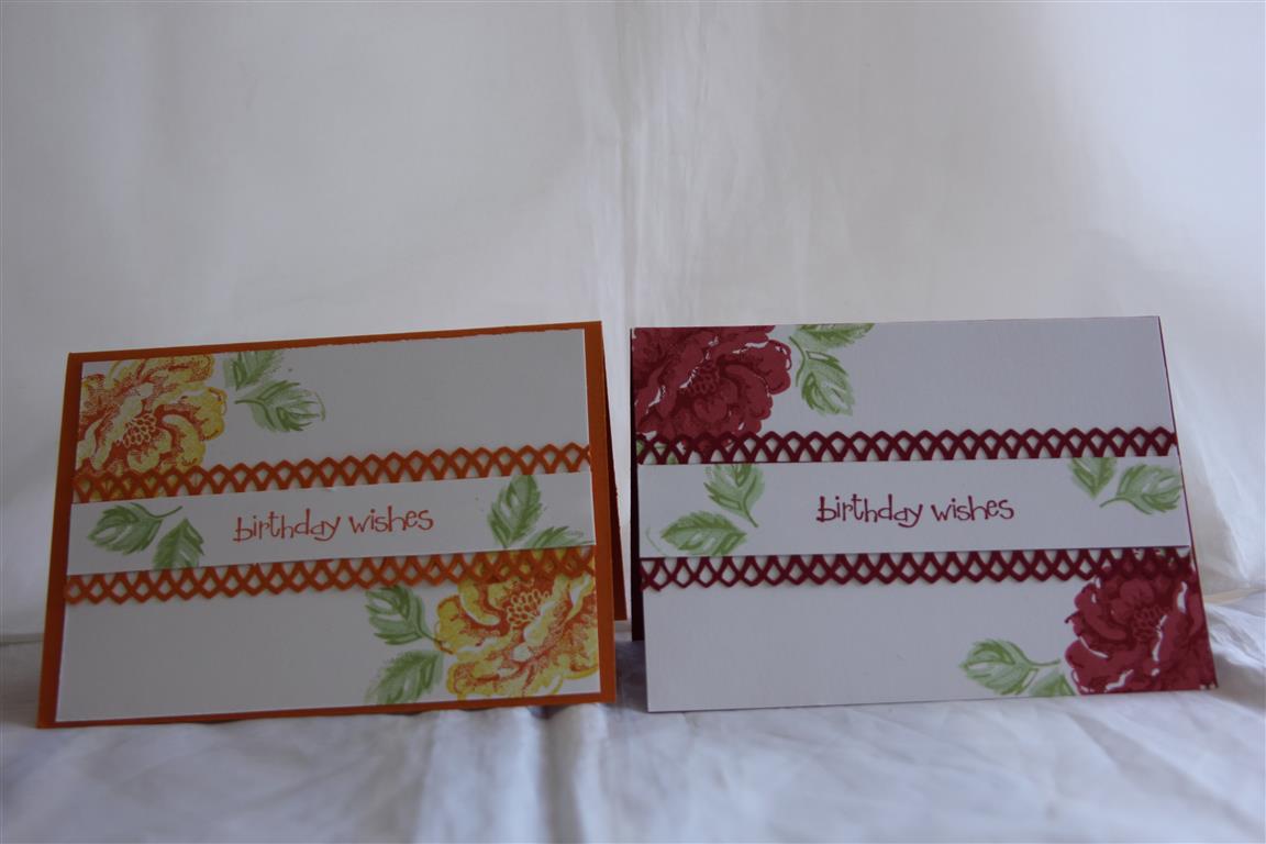 IMG_0306 (Medium)I thought I would show some stamped cards I made a couple of weeks ago. These two cards are made with Stampin Up Stippled Blossoms stamp set. Its a two step stamping technique. the first stamped layer is a solid stamp, and you stamp it in a lighter colour, then use the second stamp in a darker colour over the top to get a more defined image. On the left I used stampin up inks – daffodil delight and tangerine tango, and on the card on the right I used stampin up rasberry ripple and primrose petals. The leaves were done with garden green and pistachio pudding inks. I used an E K Success punch on both cards. Still struggling with this rotten cold, so it’s been a lazy day for me! Til tomorrow….