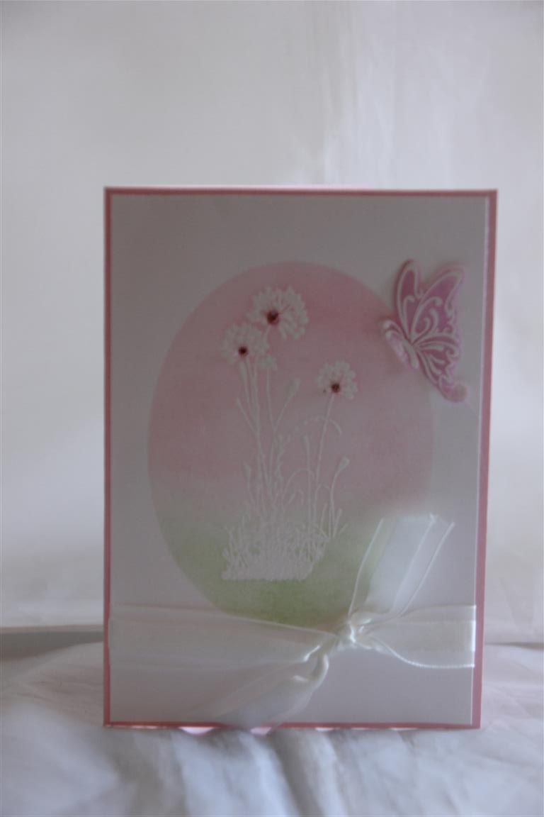 straight away I want to say this was not my idea – I saw it on pinterest, but had to try it! I liked the idea of using my oval die to use as a stencil. I stamped the serene sillouttes stamp( Stampin Up) in versamark ink onto white cardstock, and white embossed it, die cut and oval and used what would normally be the waste to pop over the card and inked through it with green and pink inbk.The heat embossed image resisted the ink. I also heat embossed a butterfly stamp on vellum, and coloured it witgh pink ink before fussy cuuting and attaching to the card. Wrapped the whole panel with with organza ribbon.I thoroughly enjoyed doing this ione, and time permitting will experiment further with different shapes and stampoed images! Til tomorrow….